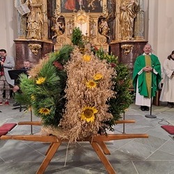 Dank der vielen Kinder, die mit Begeisterung dabei waren, wurde der Erntedanksonntag zu einem besonders lebendigen Fest. Die Erntekrone wird jedes Jahr von der Landjugend gebunden und ins Gotteshaus gebracht.